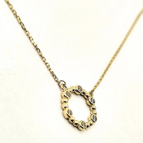 Това изискано колие от 14 к злато е съвършената комбинация от модерен дизайн и класическа елегантност. Колието има изтънчена дизайн, с акцент бели камъни